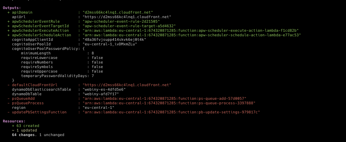 The create operations are related to new Amazon EventBridge that is now deployed with the new Webiny setup, and also the “block-public-access” policy for File Manager’s Amazon S3 bucket (ensures bucket objects are not public).