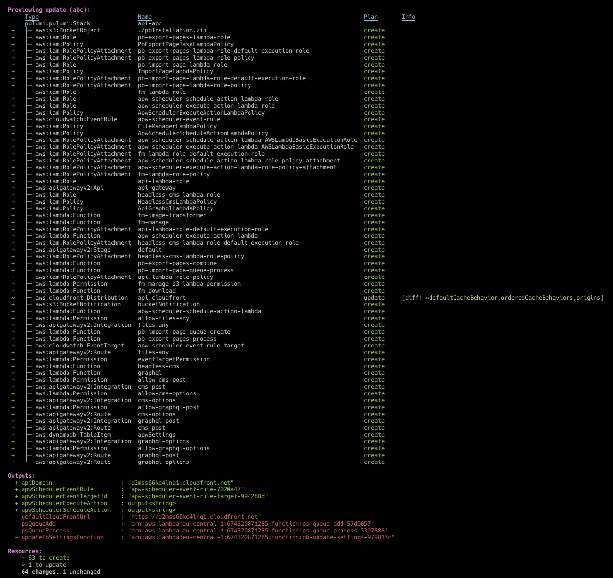 As we can see, we have changes in targetOriginId properties and within the origins property. Essentially, the existing Amazon Cloudfront distribution is just linked with the newly deployed API Gateway. If those are the only differences that the preview command showed, then we’re almost ready to deploy.